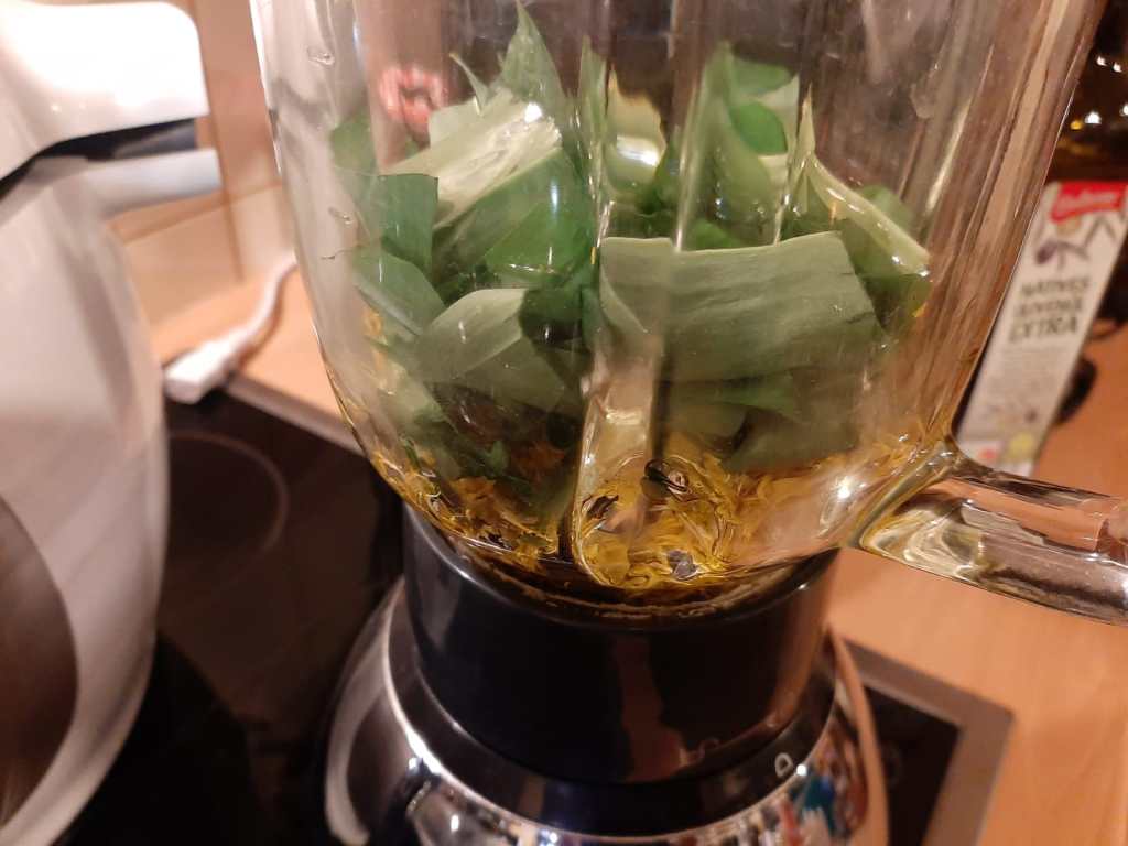 Bärlauch gegebenenfalls (siehe oben) waschen, trocknen, und zusammen mit den Löwenzahnblüten und dem Öl in einem Standmixer oder mit dem Pürierstab in einem geeigneten Gefäß 4-5 Minuten gründlich mixen.