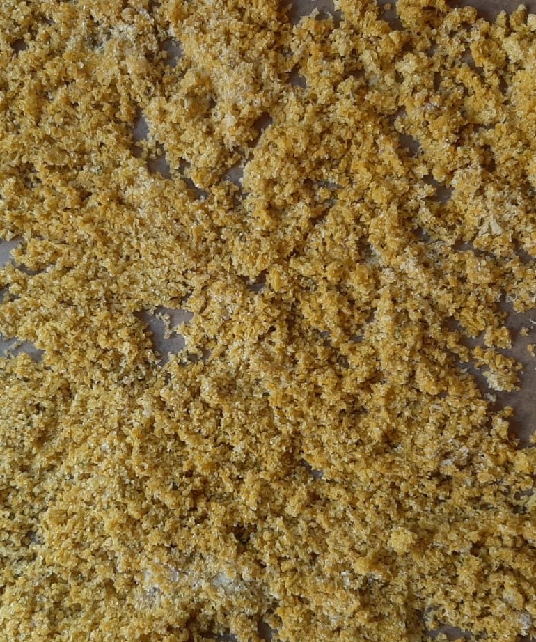 Das Gemisch verteile ich auf einem mit Backpapier ausgelegten Backblech und lasse es an einem warmen (vor allem trockenen!) Ort 1-2 Tage trocknen. Das geht auch im Backofen oder Dörrautomaten bei max. 40 °C, das dauert je nach Feuchtigkeitsgehalt der Masse unterschiedlich lange – wenige Stunden können schon ausreichen. Am besten genau wie bei der Methode mit dem Backblech zwischendurch kontrollieren.