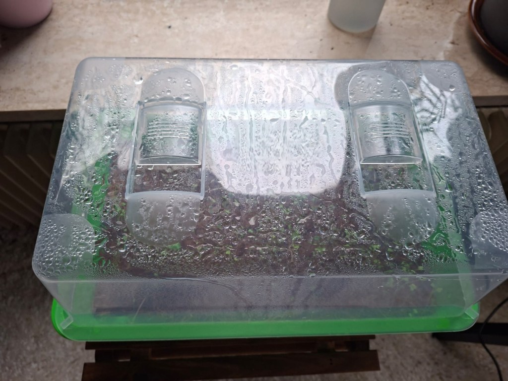 Das Mini-Gewächshaus hat soweit gut funktioniert. An einem hellen Fenster in der Nähe der Heizung, weil es in den Räumen sonst zu kühl ist.